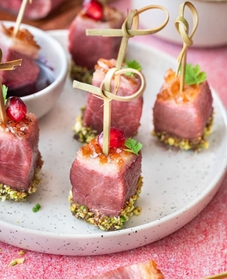 Découper le magret en cubes et les piquer avec des pics en bois. Tremper la base dans la mélasse de grenade puis dans la poudre de pistaches de manière à recouvrir le bas de chaque face.
