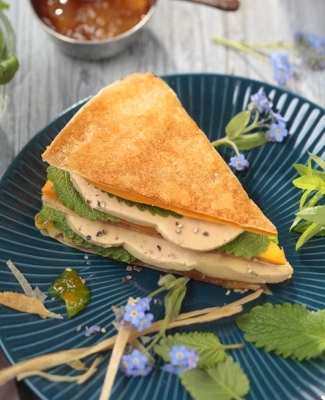 Couper le Foie Gras en 8 tranches fines. Déposer sur chaque triangle un peu de marmelade d’orange, une tranche de Foie Gras, quelques fines lamelles de mangue et quelques feuilles de mélisse, saler et poivrer. Recommencer l’opération puis déposer un dernier triangle de brick.