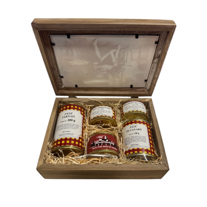 Ce coffret contient un superbe Bloc de foie gras de canard 65g, et un lot de 4 pâtés.