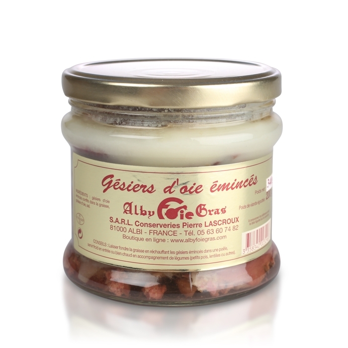Gésiers d'oie émincés, confits dans la graisse d'oie.